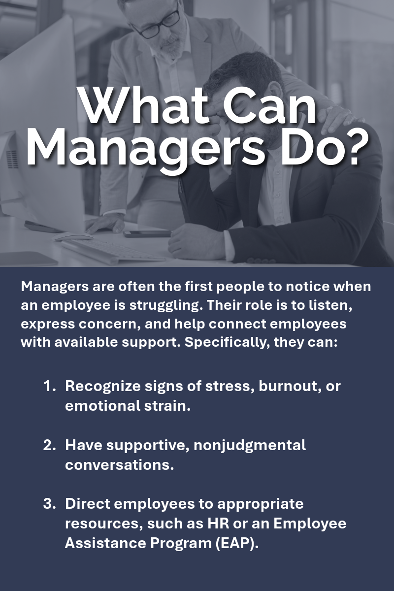 Managers are often the first people to notice when an employee is struggling. Changes in behavior, performance, or engagement may signal that someone is experiencing stress or burnout.